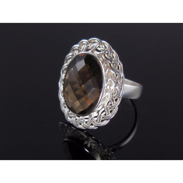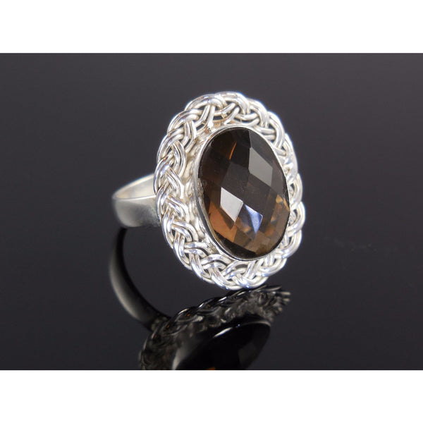 Made with 10x14mm oval faceted smoky quartz gemstone, sterling silver bezel and wire. Size 5.75